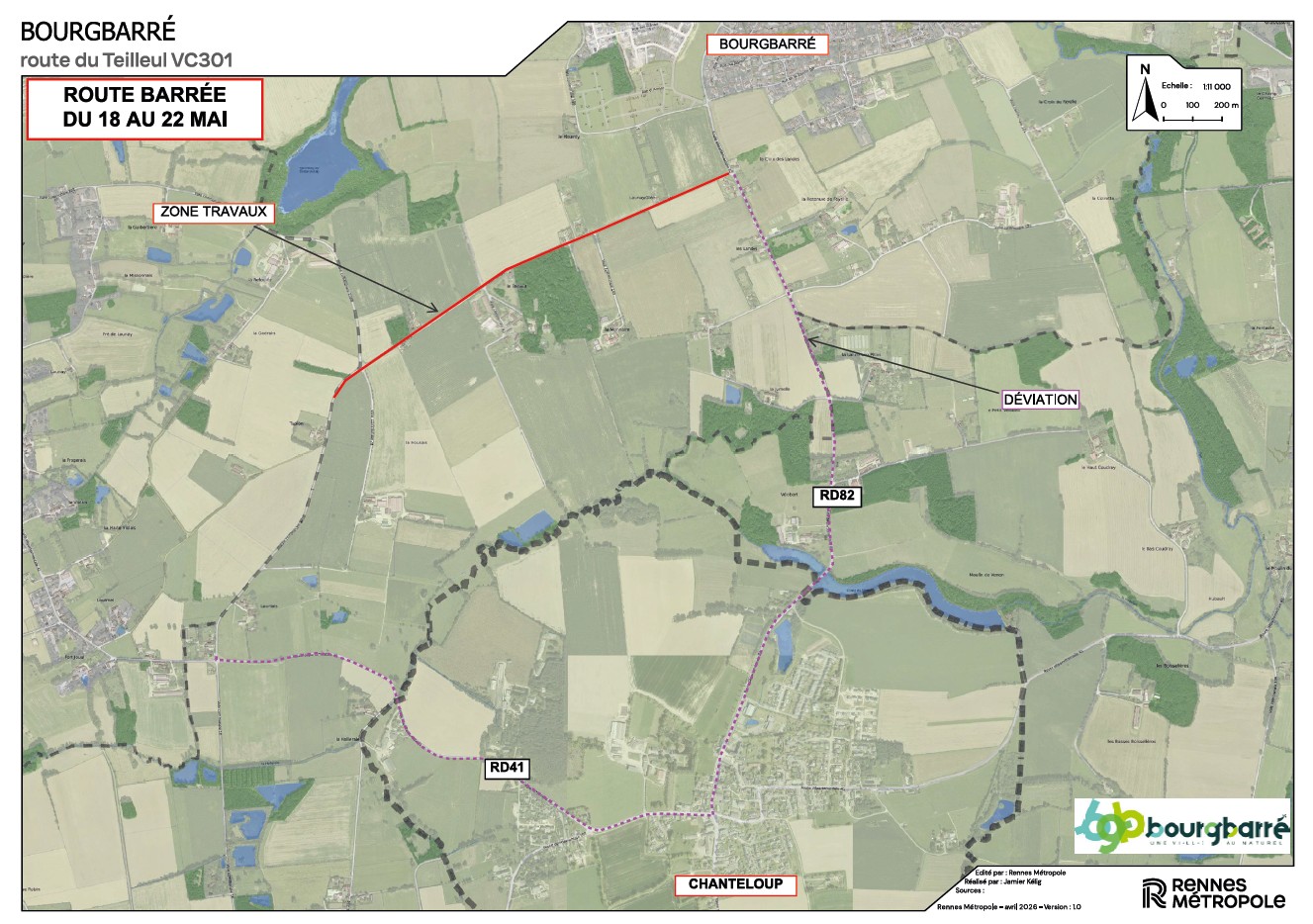 Rennes Métropole va procéder à des travaux de voirie (réfection de la couche de roulement) route du Teilleul (VC 301) entre le lieu-dit La Croix des Landes et la VC 201 à Bourgbarré, du lundi 18 au vendredi 22 mai 2026 (voir plan ci-dessous)